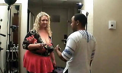 Fat blonde with big saggy tits stumbles onto a Big Black Cock porn set